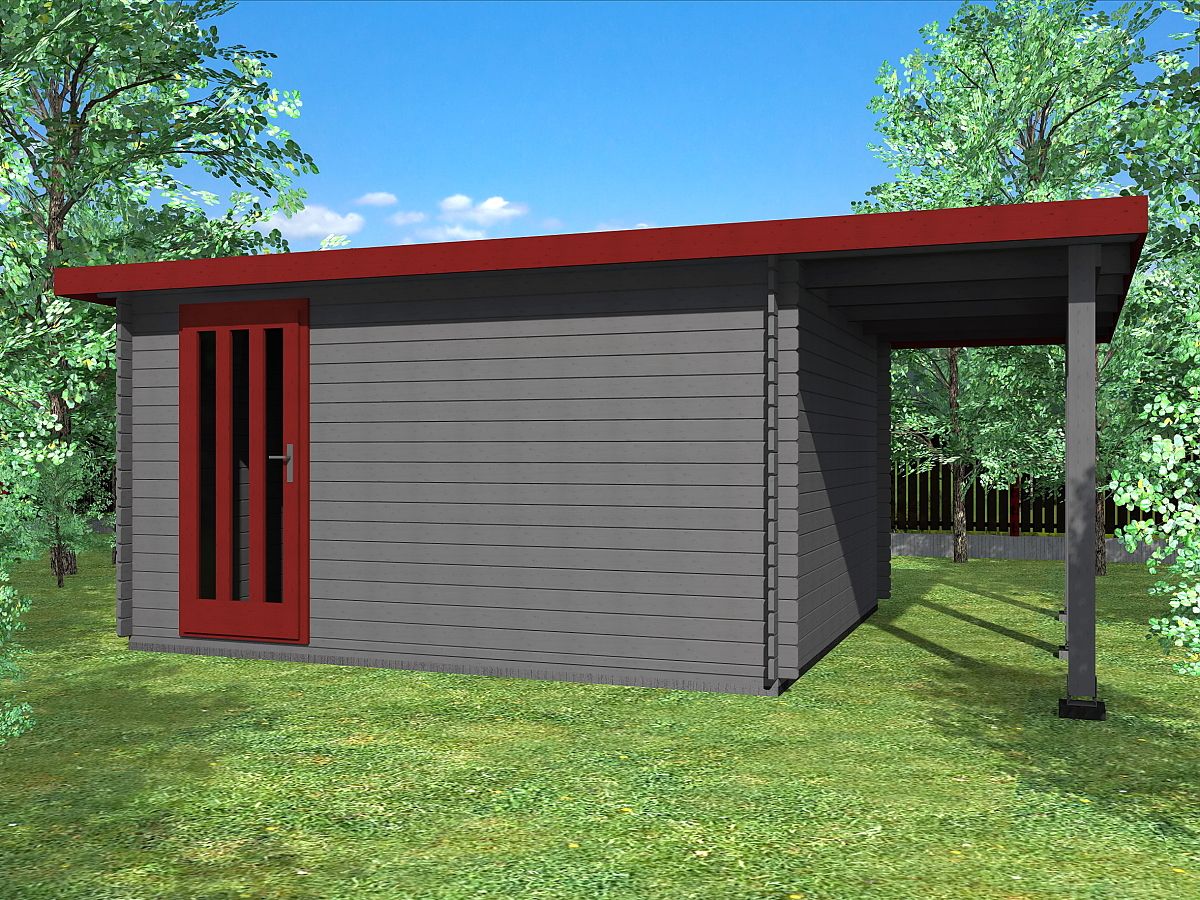 Zahradní nářaďový domek moderního vzhledu o síle stěny 33 mm s bočním přístřeškem na pravé straně. Rovná pultová střecha se sklonem 2o. Naimpregnovaný základový rám je součástí výrobku. Střecha je tvořena pohledovými smrkovými palubkami. Domek obsahuje jednokřídlé dveře. Doporučujeme si přiobjednat námi nabízenou střešní krytinu, která je vhodná pro malé sklony střech.